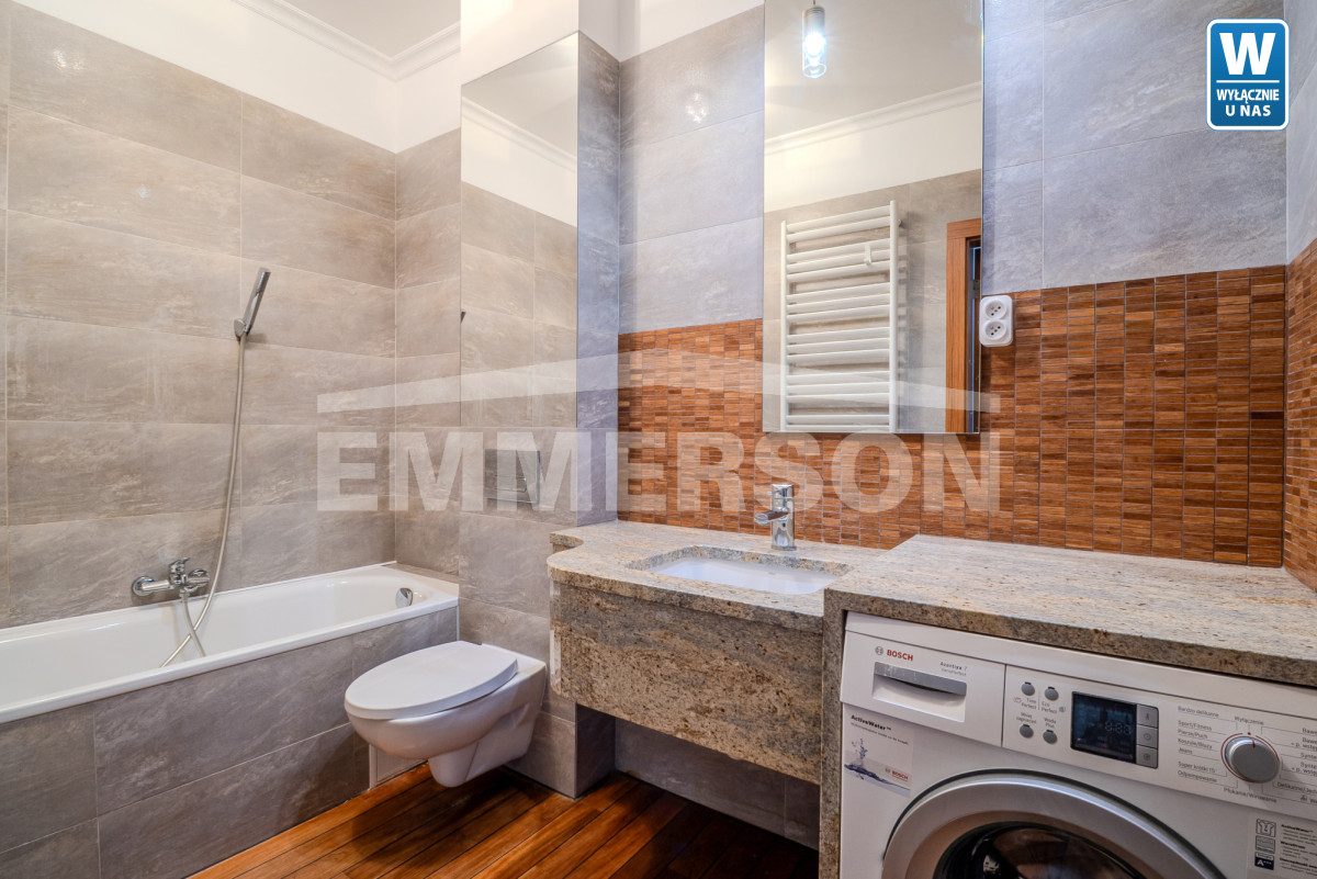 Mieszkanie wykończone jest w sposób bardzo estetyczny i trwały, z użyciem materiałów wysokiej jakości- m. in. na podłogach ułożony jest parkiet drewniany – naturalny, ciepły w odbiorze, natomiast łazienka wyróżnia się elegancką zabudową wykonaną na wymiar z marmuru