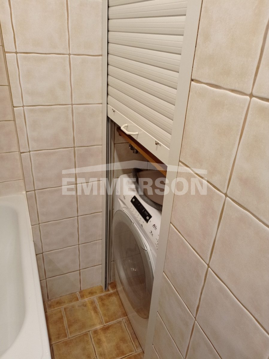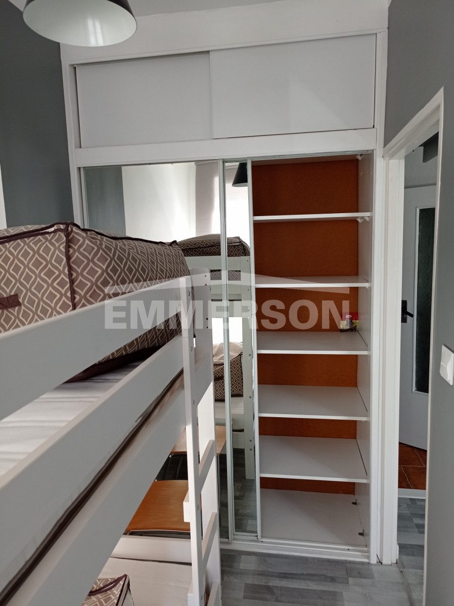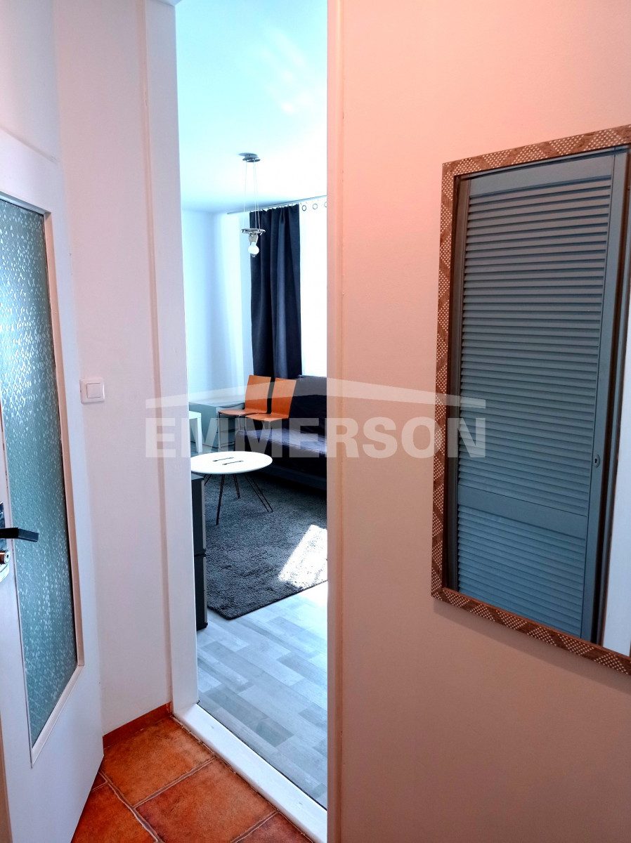 Mieszkanie umeblowane: zabudowa kuchenna (z lodówką), w sypialni łóżko i szafa wnękowa, w dużym pokoju komoda, łazienka z wanną, umywalką i pralką oraz szafą wnękową. W przedpokoju szafa wnękowa na ubrania.