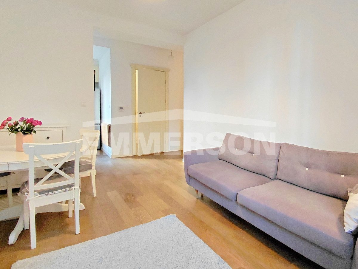 Mieszkanie jest wykończone materiałami wysokiej jakości (m. in. drewniane podłogi, wysokiej klasy drzwi wewnętrzne, meble robione na zamówienie), umeblowane i wyposażone.