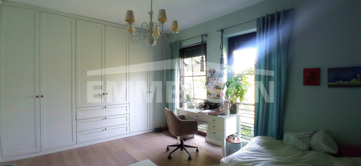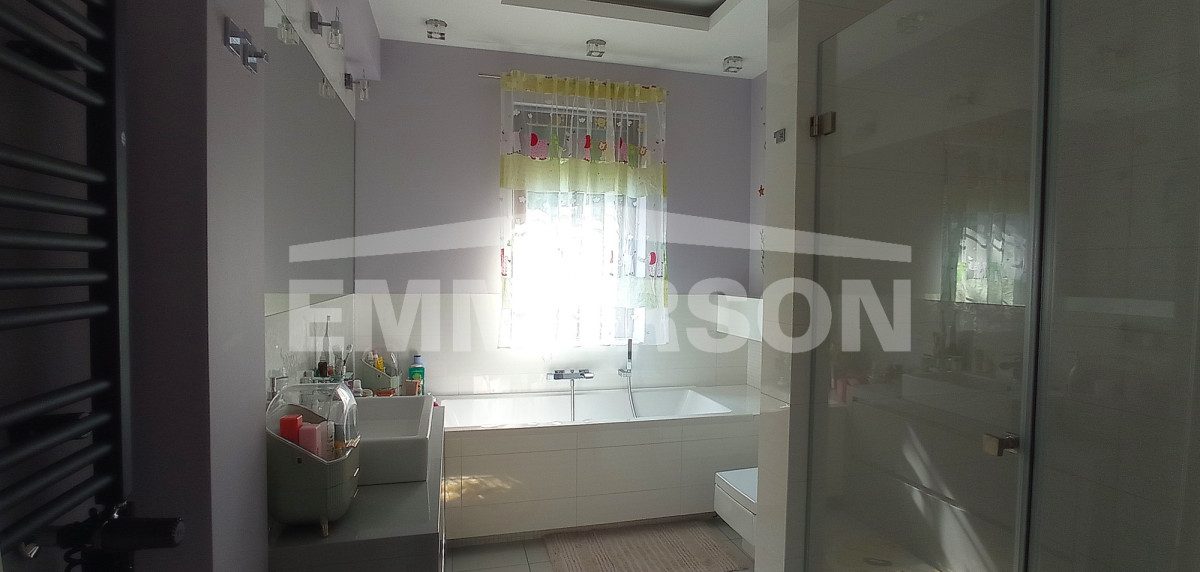 Istnieje możliwość zrobienia dodatkowej sypialni z dużej i widnej garderoby.Docelowo można stworzyć dom z salonem i 5 sypialniami.Na pogach jest gres i biały marmur w hallu – podłogi podgrzewane. Na piętrze jest drewno dąb bielony.