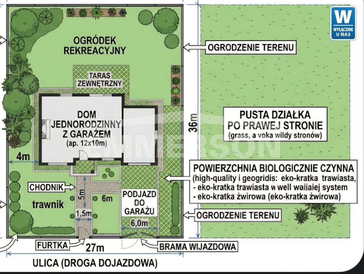 Działka o powierzchni 998 m² i wymiarach ok. 27 x 36 m daje szerokie możliwości aranżacyjne – zarówno pod elegancką willę, jak i nowoczesny dom dwulokalowy.