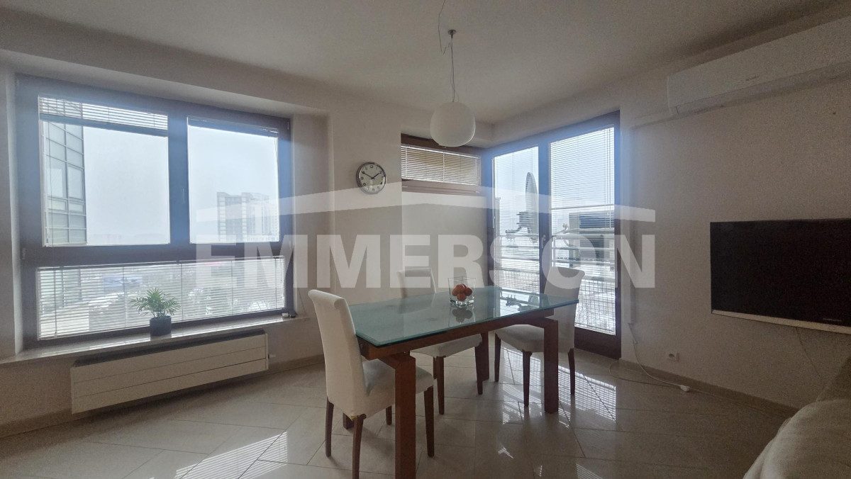 Salon jest przestronny, przeszklony z dwóch stron, dzięki czemu wnętrze jest wyjątkowo jasne i doświetlone. Z okien roztacza się przepiękny widok na panoramę miasta.