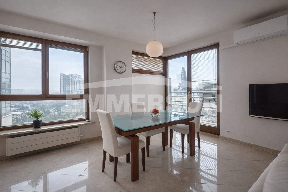 Salon jest przestronny, przeszklony z dwóch stron, dzięki czemu wnętrze jest wyjątkowo jasne i doświetlone. Z okien roztacza się przepiękny widok na panoramę miasta.