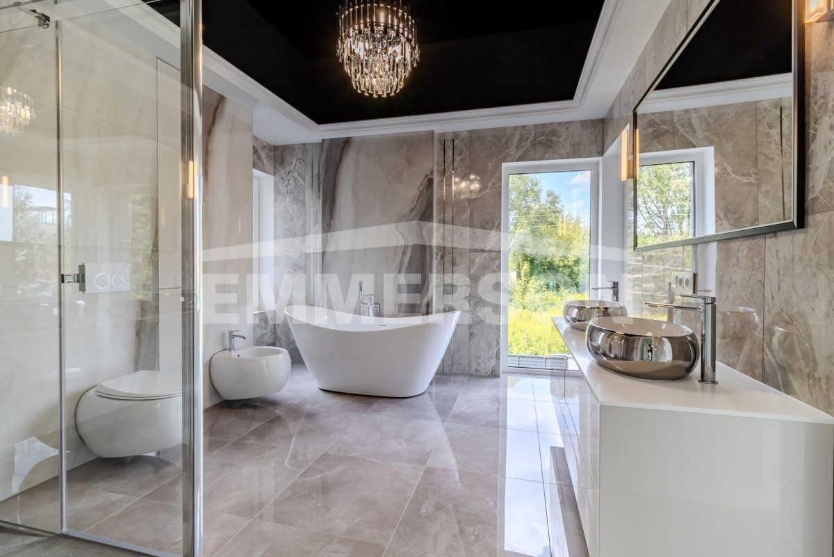 Posiada 7 łazienek, 6 pokoi, saunę, garaż na 3 samochody, basen zewnętrzny, ( 9mx4,5 m, głębokość 1,5 m) kominek, pralnia, spiżarnia,. podgrzewane wjazdy i bramy. Możliwość parkowania dodatkowo 6 samochodów na działce.