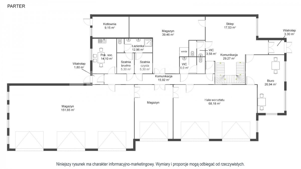 Parter: hala 200 m² + pomieszczenia biurowe ok. 200 m²
